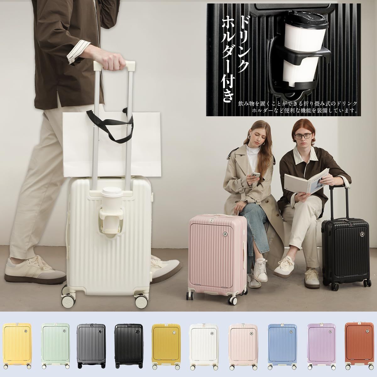 GURAMU スーツケース キャリーケース キャリーバッグ フロントオープン 機内持ち込み S Mサイズ USBポート付き カップホルダー付き 隠しフック機能 充電機能 静音 ダブルキャスター 耐衝撃 360度回転 軽量 修学 泊まる 旅行 出張 ライラ