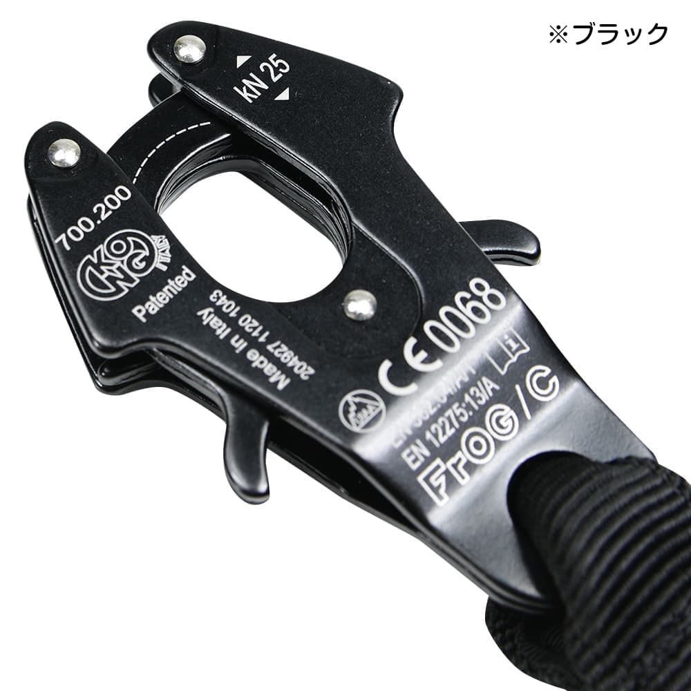 フック部分はFROGクランプになっており、アンカーポイントへの装着の際に自動的に閉鎖してロックします。突起を両側から押し下げるとフックが開き片手で解除が可能。
