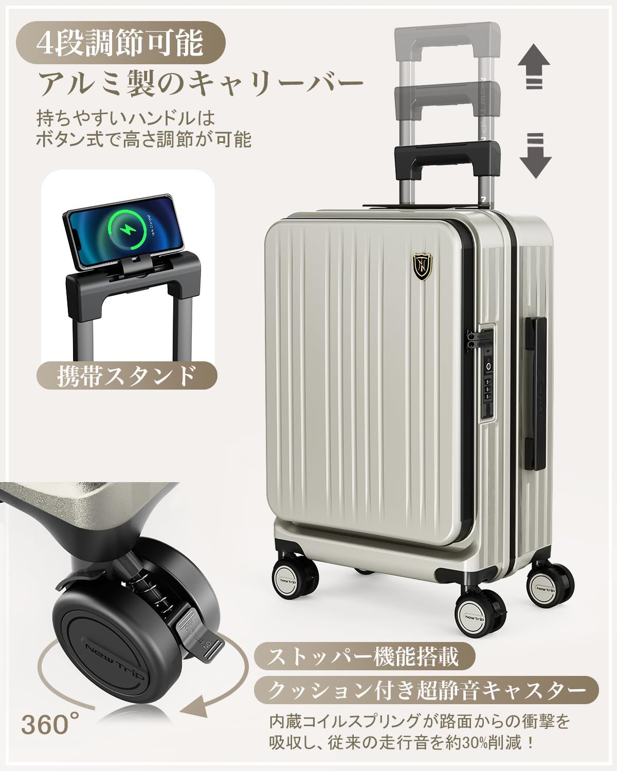[New Trip] スーツケース キャリーケース フロントオーポン 片開き PC100% 拡張機能付き 機内持ち込み キャリーバッグ USBポート付き ストッパー付き スマホスタンド 隠しフック 軽量 大型 S/M/Lサイズ 耐衝撃 ファスナータイプ 静音ダブルキャスター TSAロック 海外 旅行 ビジネス 出張 (オートミールグレー、Sサイズ/機内持ち込み/1~3泊)
