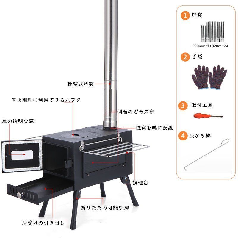 薪 ストーブ アウトドア 調理器具 暖炉 キャンプ 折りたたみ 煙突付き 耐熱ガラス窓付き 組立式 屋外 焚き火台 BBQ 暖房 コンロ ブラック