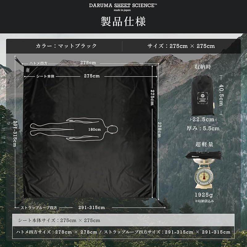 商品名:【日本工房製】DARUMA SHEET|2色×7サイズ展開 グランドシート 防水 275×275cm 大判 厚手 レジャーシート テントシート(マットブラック, 275cm×275cm)
