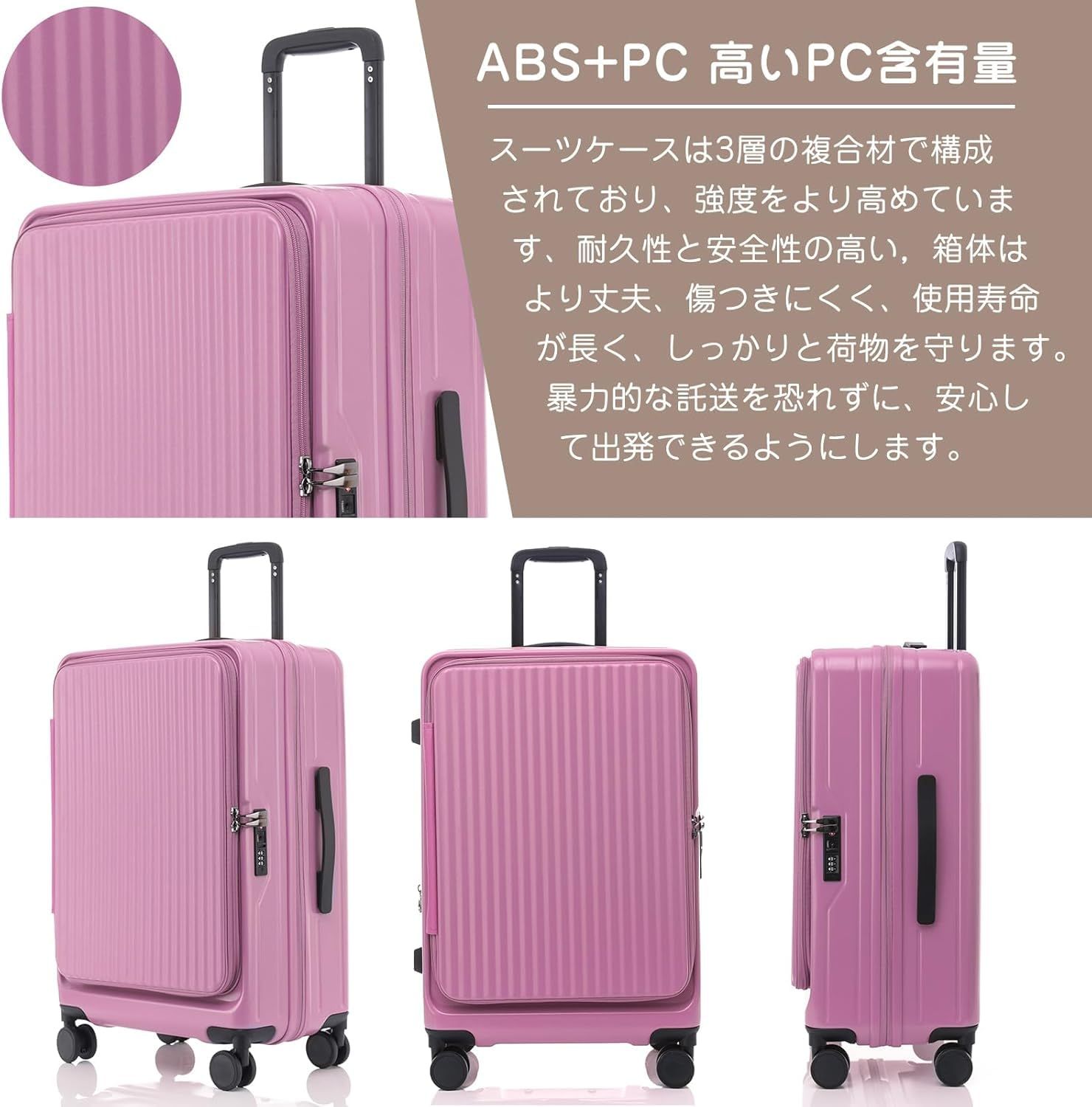ハード 拡張機能付き フロントオープン 片開き 大容量 機内持ち込み 超軽量 ファスナータイプ キャリーケース カップホルダー付き TSAロック キャリーバッグ 横開き スーツケース ビジネス 出張 1-3泊 ローズピンク Yuweijie 40 l 47リ