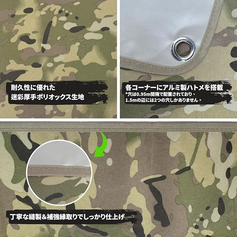 【多用途&オールシーズン対応】グランドシート、タープ、シェルター、サバイバルギアとして多用途に活躍。春夏は日よけやレジャーシートとして、秋冬は地面からの冷気・湿気を遮断する防寒シートとして使用可能。迷彩柄が自然に溶け込み、アウトドア・防災・緊急時にも頼れる一枚です。
