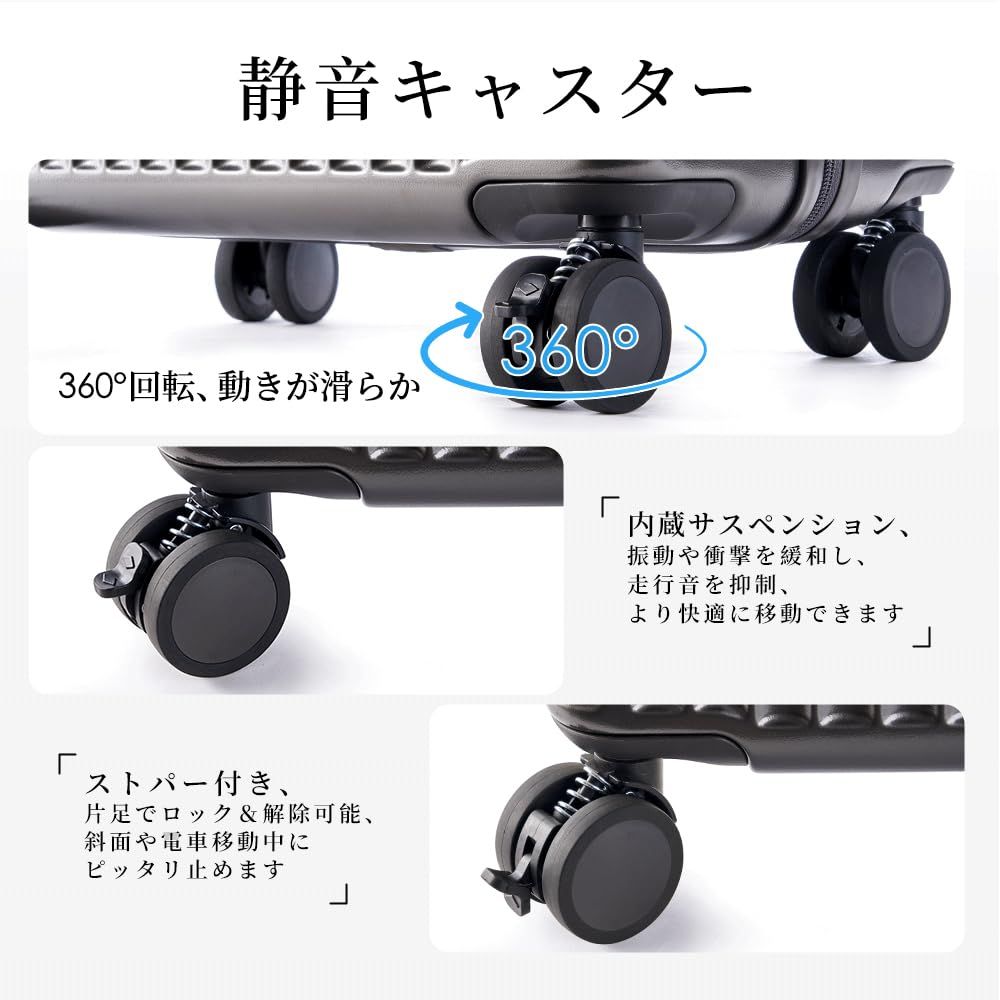 軽量でありながら耐衝撃性・耐久性に優れた純PCスーツケース。20インチのコンパクトサイズは、国内線・国際線の機内持ち込みに対応し、13泊程度の短期旅行や出張に最適です。 高級感のある縦ラインのクラシックデザインで、スーツにもカジュアルにもマッチ。男女問わず使えるユニセックス仕様です。 360°回転可能な静音ダブルキャスター、減震構造、ブレーキ機能付きで移動も快適。USBポート搭載で移動中の充電も可能。 国際基準のTSAロック付きで海外旅行も安心。女性でも片手で持ち運びやすく、到着後すぐ移動できます。