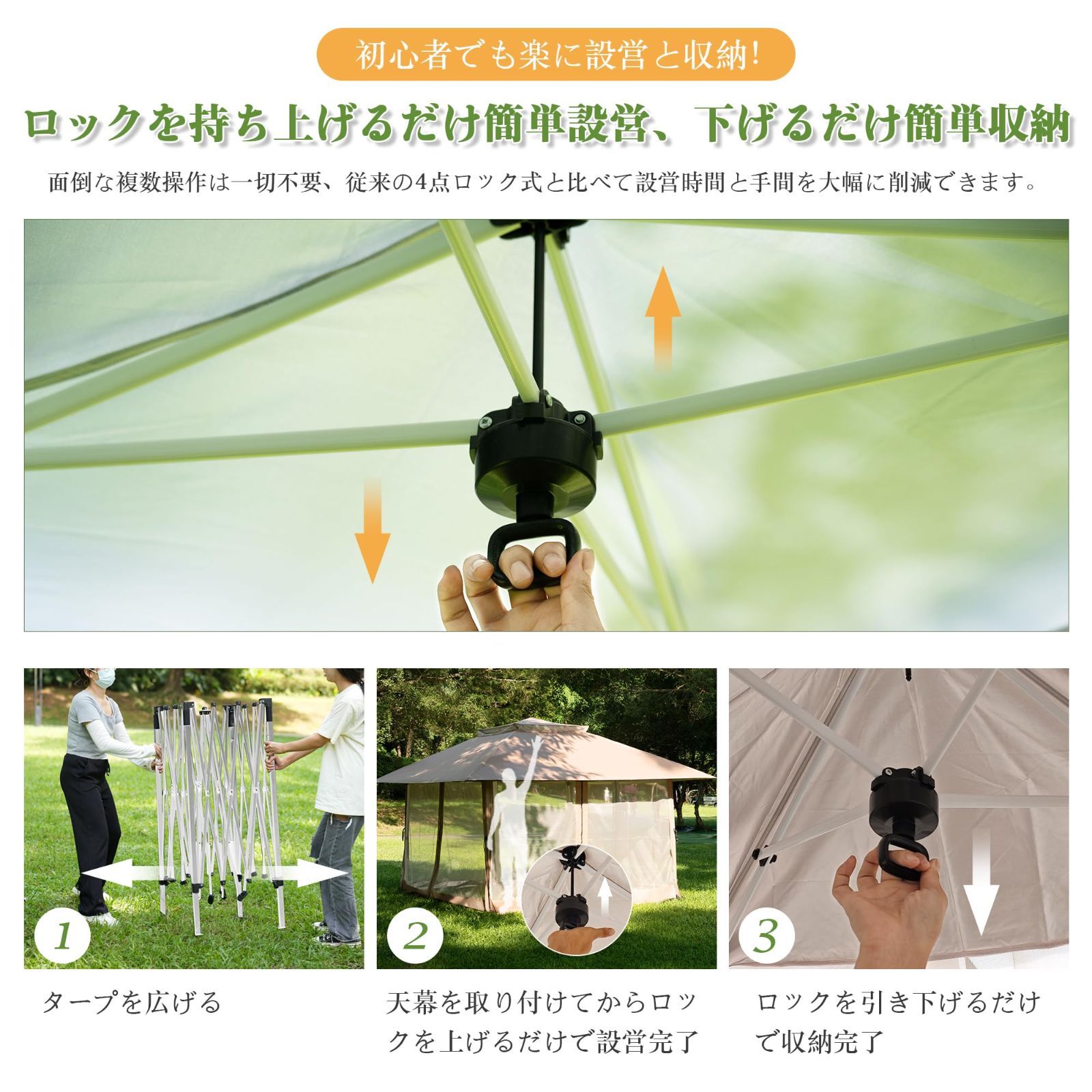 【組立簡単なセンターロック式】CYFIEのワンタッチタープテントはワンタッチするだけで展開または収納できます。センターのロックを持ち上げるだけで簡単に設営できて、引き下げるだけで簡単に収納できて、面倒な複数操作は一切不要、従来の4点ロック式と比べて設営時間と手間を大幅に削減できます。初心者でも楽に使用できます。