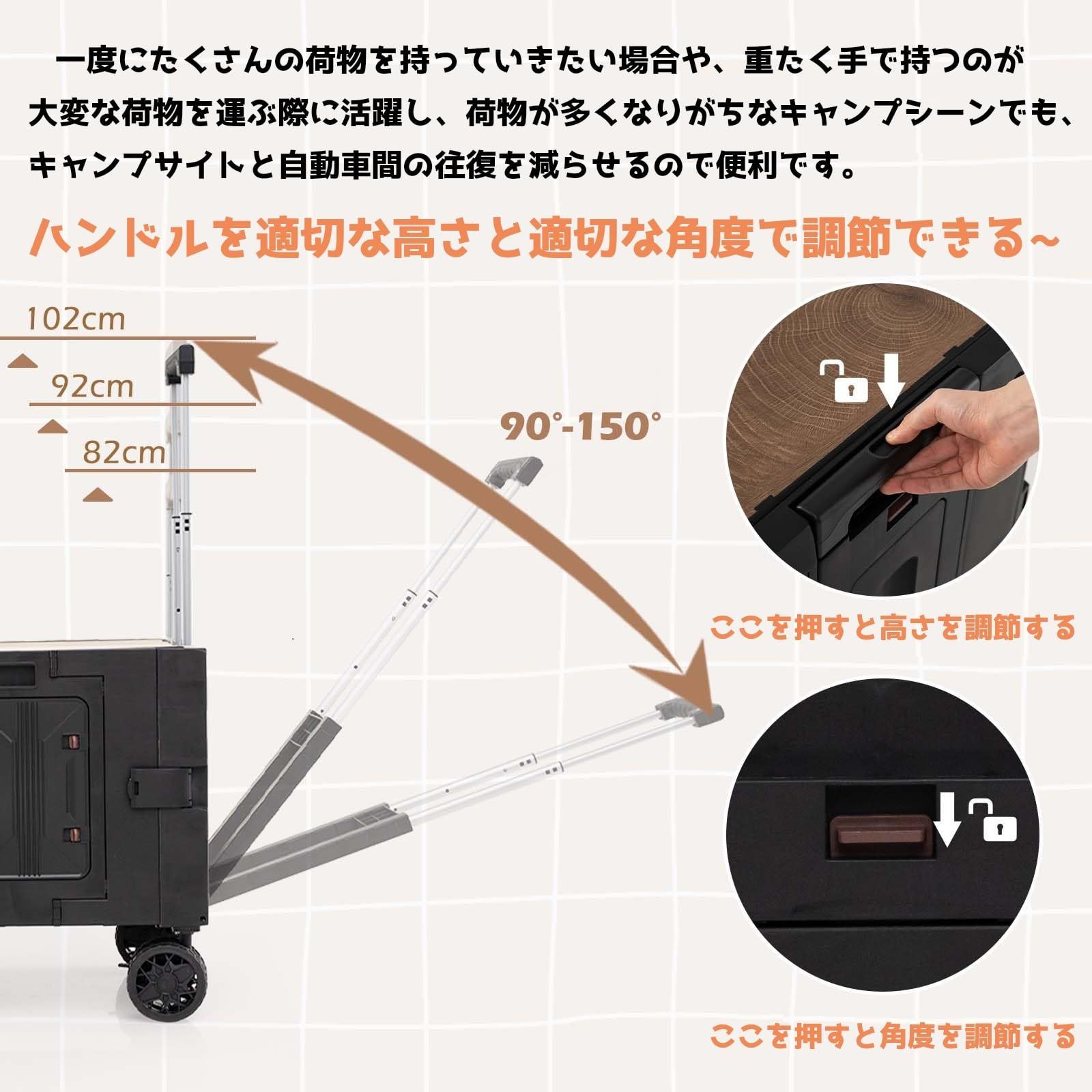 【サイズ】展開時:幅50x奥行85x高さ56cm(天板まで);折り畳み時:幅50x奥行25x高さ56cm;ハンドル高さ3段調節可能:82cm-92cm-102cm