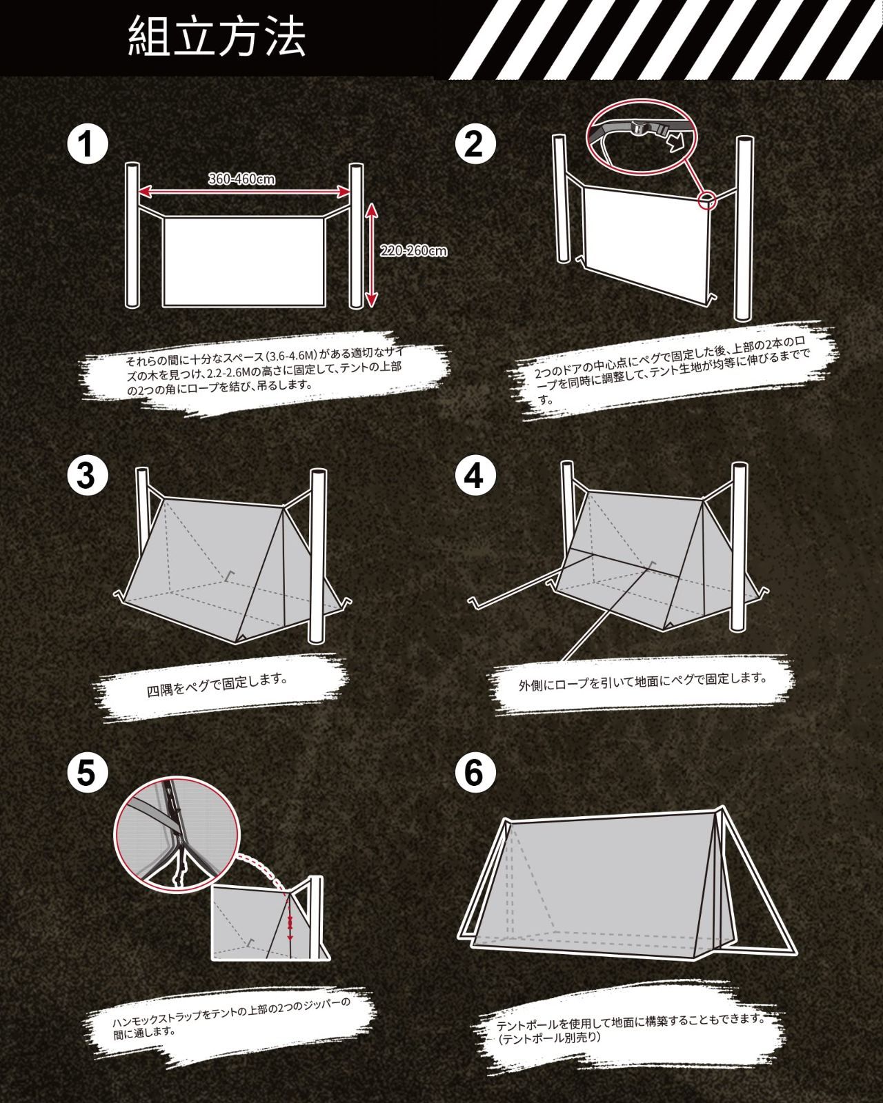 【ノーポールシェルター】超軽量アルミペグとガイライン、2つのプルシクループのある稜線を使用してセットアップできます。ニーズに合わせて、テントとタープを自由に切り替えることができます。