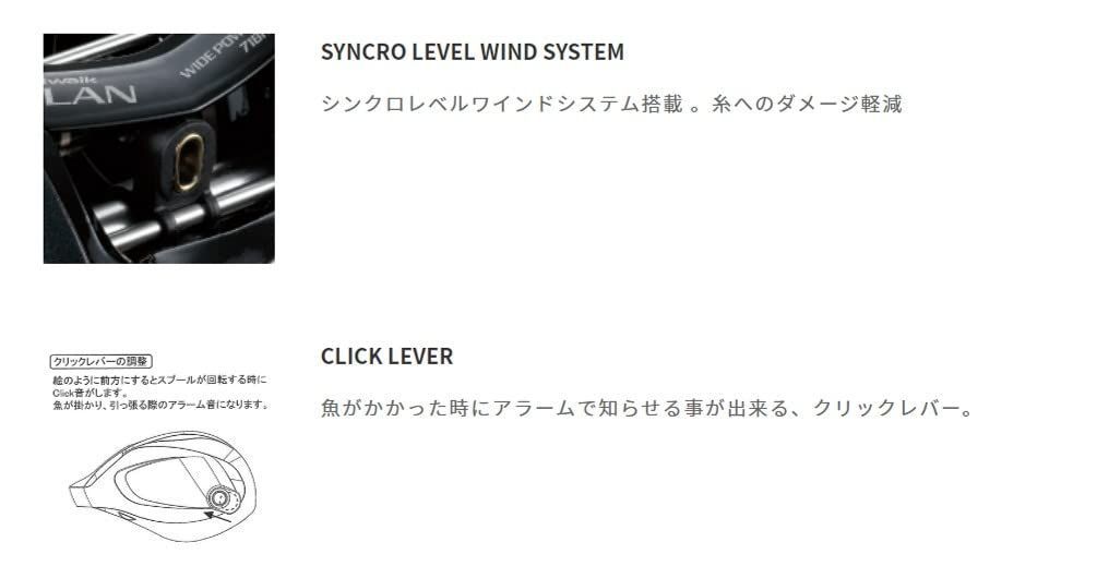 特徴:「デカノブ &シングルパワーハンドル(60&75mm可変ハンドル&EVAハンドルノブ)」「鍛造アルミ・ディープスプール」「シンクロレベルワインドシステム(糸へのダメージ軽減)」「クリックレバー(魚がかかった時にアラームで知らせる)」