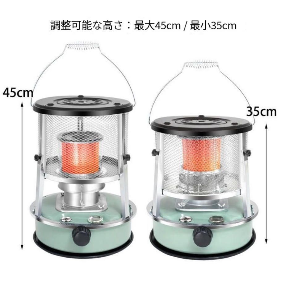 これは高さ調整可能な石油ストーブで、電源不要のポータブル暖房器具です。