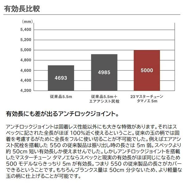 全長:5.00m 継ぎ方式:振出 継数:5 仕舞寸法:118.5cm 自重:395g 先径:16.2mm カーボン含有率:98.9% ※実物と色が違って見える場合があります。あらかじめご了承下さい。誰もが扱いやすいストレスフリーな玉ノ柄を目指して。スピーディでスムーズな振出性能と固着の徹底追放を求めた玉ノ柄の新基準を提案するマスターチューン タマノエ。■500・・・軽快な操作性が持ち味。渚や足場の低い磯場での取り回しの良さが魅力。トーナメントや片潮の釣り場で短時間に釣果を求められるシーンなどにも有効。