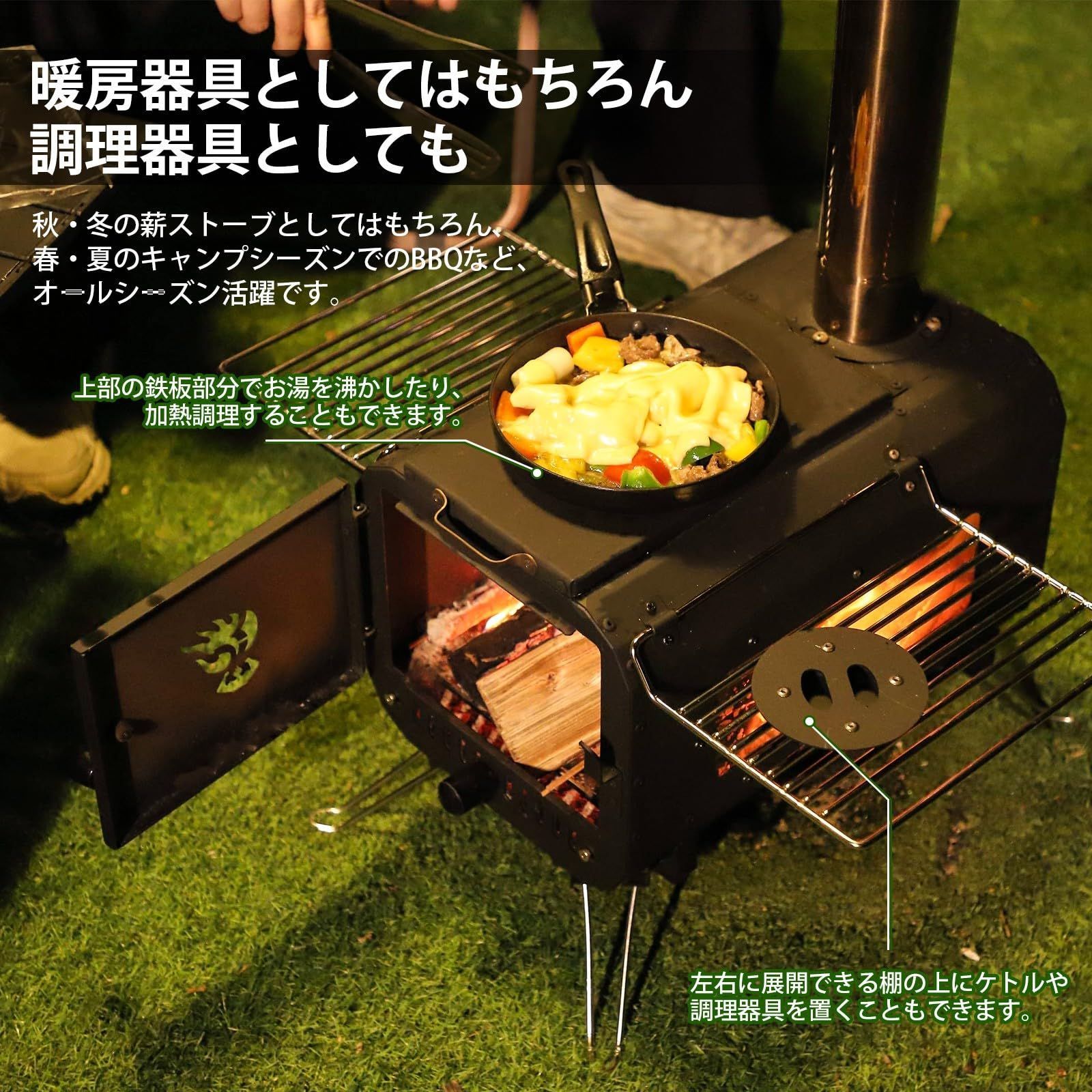 薪ストーブ 折りたたみ薪暖炉 軽量 耐熱ガラス ダンパー付煙突 キャンプ 焚き火台