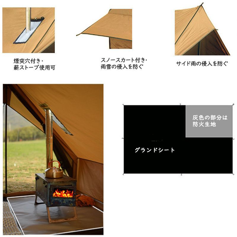 【煙突穴付き・薪ストーブ使用可・通気性のいいテント】煙突付きテントなので、冬でも暖かくキャンプを楽めます。穴部分は耐火性の高いガラス繊維で構成されて、煙突パイプに接触することができます。上部に換気口を配置して、テント内には常に新しい空気が循環します。下部に窓にはメッシュパネルが装備されていて虫除けに最適です