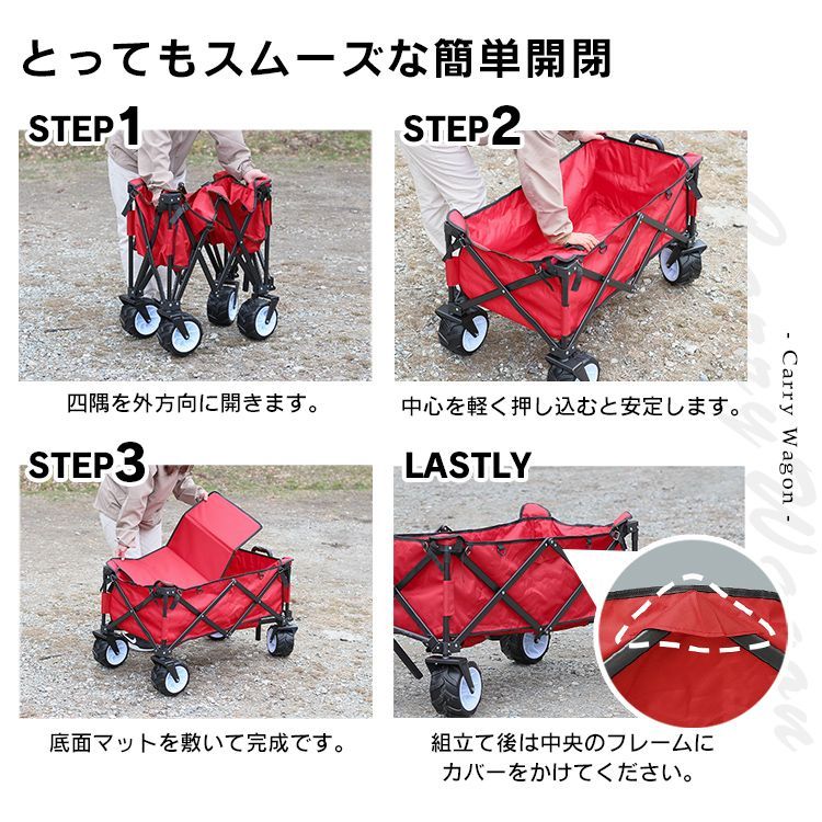 アウトドアでキャンプやバーベキューはもちろん、お買いものや運搬時にとても便利な大容量キャリーカートです。