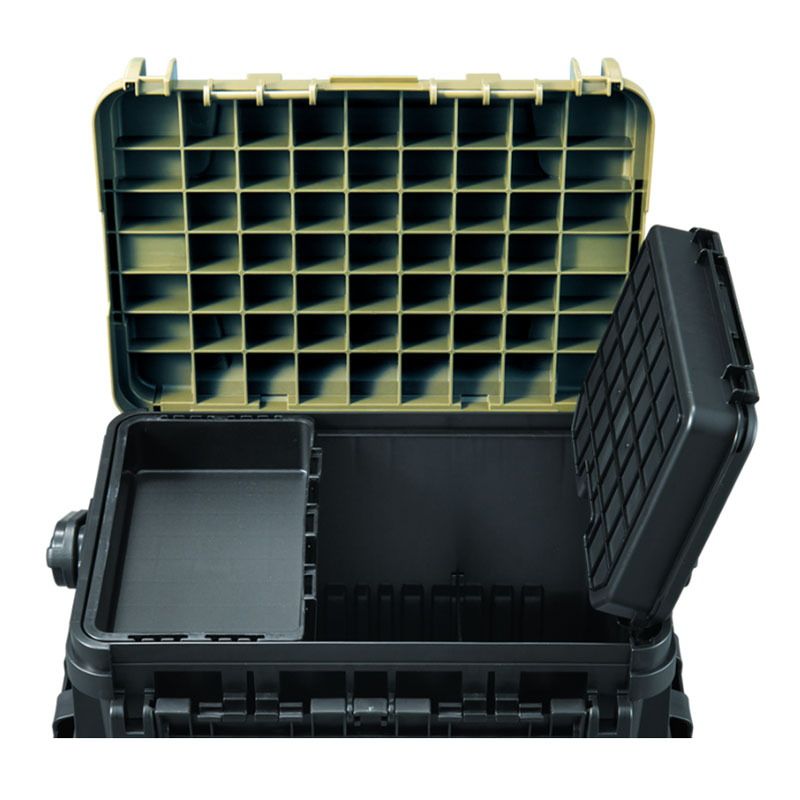 ●リフトアップシステム採用。下段に収納しているタックルを取り出す際に中皿をボックスの外へ退ける煩わしさを解消!リフトアップシステム搭載のインナーケースを持ち上げることで下段のタックルへのアクセス性がアップ!