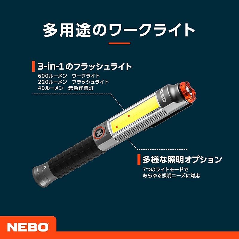 ●多機能な3-in-1懐中電灯(先端)と作業灯(側面)で7つのライトモード●底面マグネット付きです。●ポケットやベルトに取り付けて、頑丈なクリップで持ち運びできます。●単3電池3本で駆動します