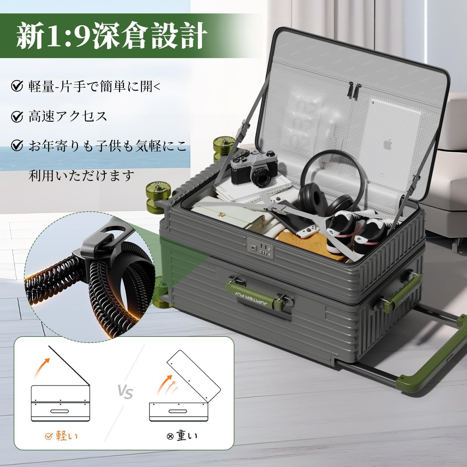 【革新的な1:9の型で スーツケース】収納スペースが、展開すると半分個づつの大きさのキャリーケースと違い、革新的な1:9の型で、深めの半分、ヘルメットや小型炊飯器、靴など、通常のスーツケースには入らない荷物も立てて入れられて、 もう片方に細かいモノを入れたりと、スッキリと収納が出来ます。