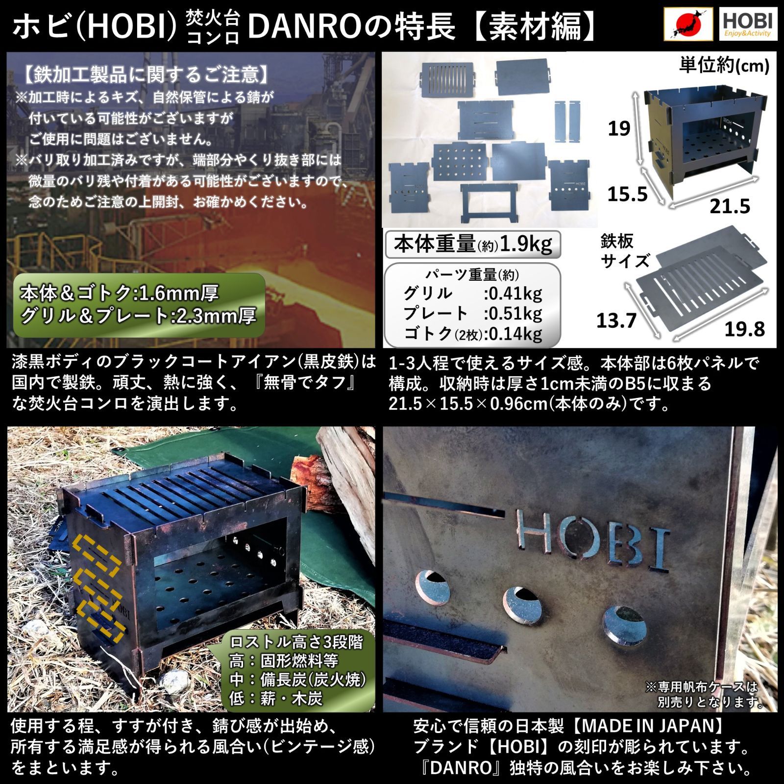 HOBI 焚火台コンロ DANRO 漆黒のブラックコート鉄 無骨でタフ 3 WAY グリル&プレート&ゴトク 付き 歪みにくい重厚鉄 21. . キャンプ ソロ ファイア 焚き火台 MADE IN JAPAN