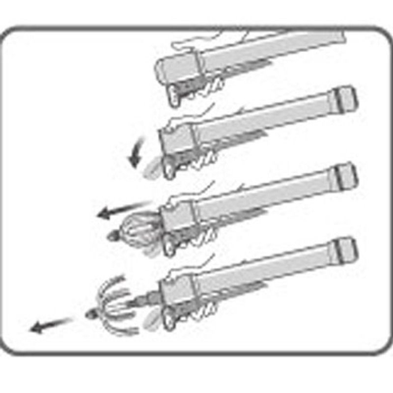 収納時にはセーフティカバーとキャップはロックされているのでギャフが不用意に飛び出したりしません。リリースボタンを押すとキャップが開くので、勢いよく振り出すだけでギャフが飛び出し自動で開き、片手だけで素早いランディングが可能です。マグネット&セーフティロープ内蔵のMgハンガーは、カラビナでベルトループやバッグ等に装着でき、ランディング時には、マグネットバックルを折るように外すだけで簡単に脱着ができます。(マグネット垂直加重 約4.5kg)また、移動時にはハンガーをポケット等に引っ掛けることで不意の脱落を防ぎ、もしもの脱落にも回収出来るように、セーフティロープを内蔵しています。