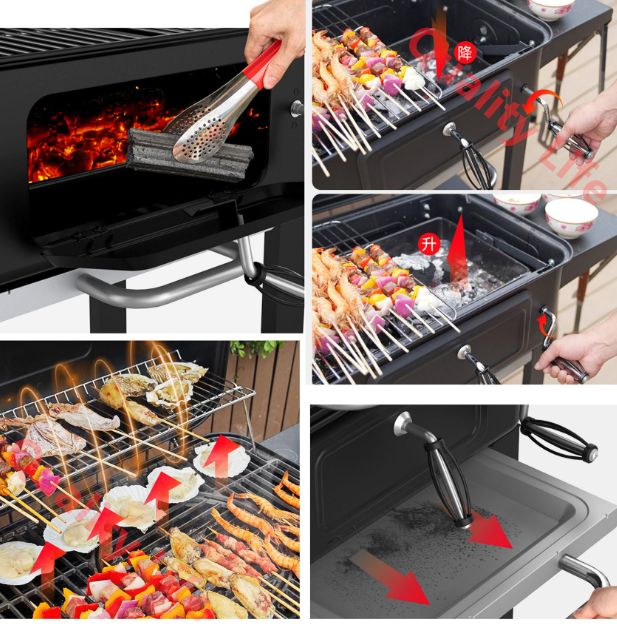 ? バーベキューグリル:プルアウト炭化設計により、カーボンを追加してグリルを引っ張る痛みに別れを告げ、便利で速く、常に油と灰を受け取り、面倒なクリーニングの問題に別れを告げます。 ハンドルで炭皿の高さを調節できるので、炭と食材の距離を正確にコントロールでき、熱利用効率を最大限に高めます。