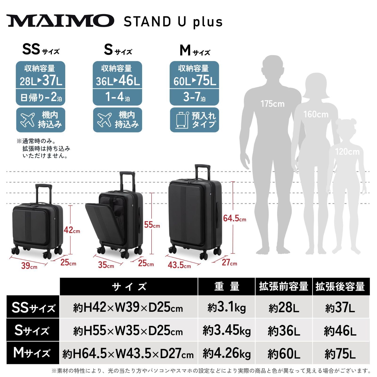 MAIMO スーツケース Sサイズ 機内持ち込み 日本メーカー フロントオープン×8 cm拡張機能付き 静音キャスター ストッパー付き HINOMOTO フロントオープン 前開き キャリーバッグ キャリーケース STAND U plus