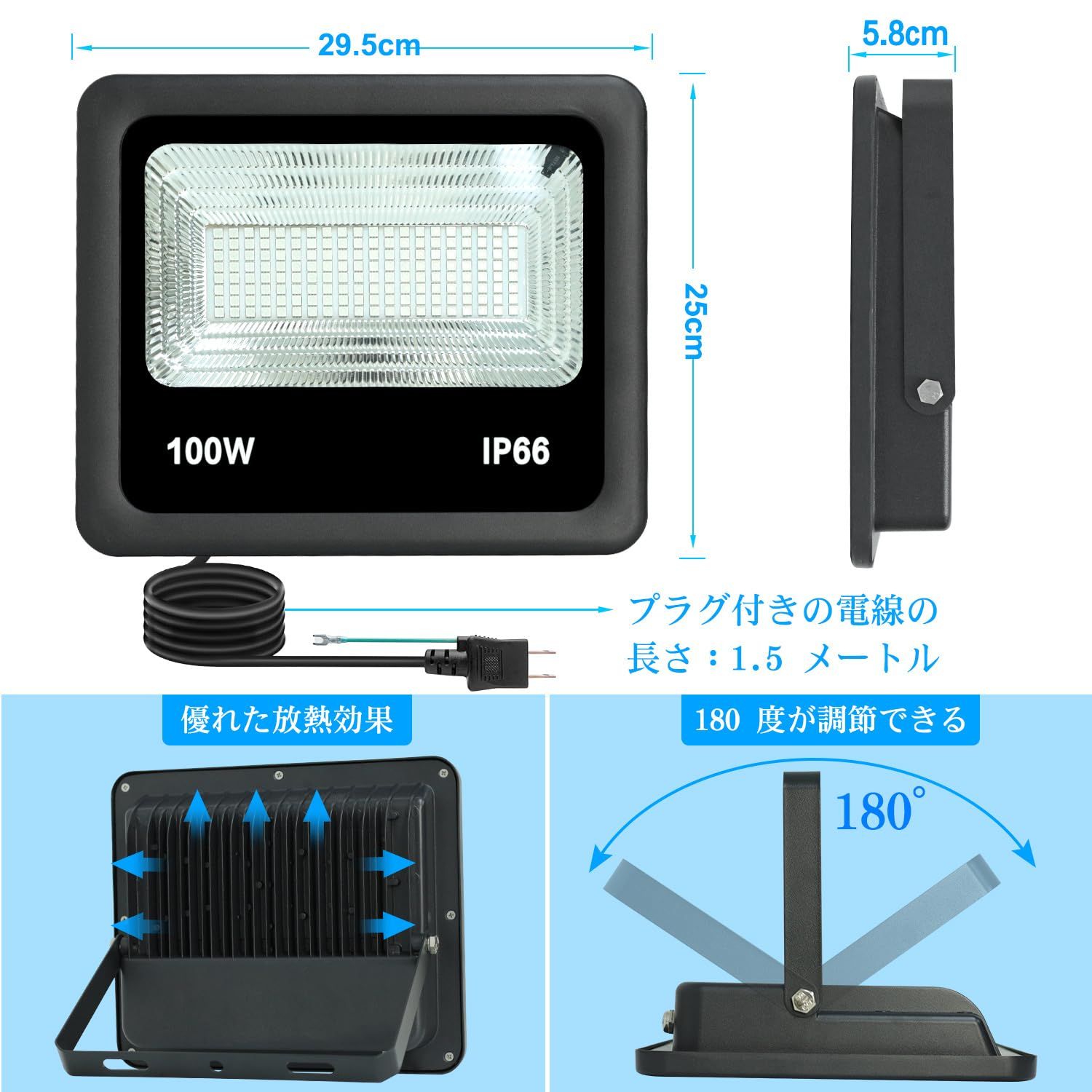【LED投光器商品仕様】光源:LED, パワー:100W (ハロゲン500W相当), 照射角度:120°, 照明範囲:10Mx10M, コンセント式:2ピンプラグ + アース線, 入力電圧:90-110V対応(50/60Hz), コード:1.5メートル, 防水等級:IP66, リモコン操作簡単 色:W=白色, R=赤色, G=緑色, B=青色, 紫色 オレンジ色 黄色 水色など20種類色。